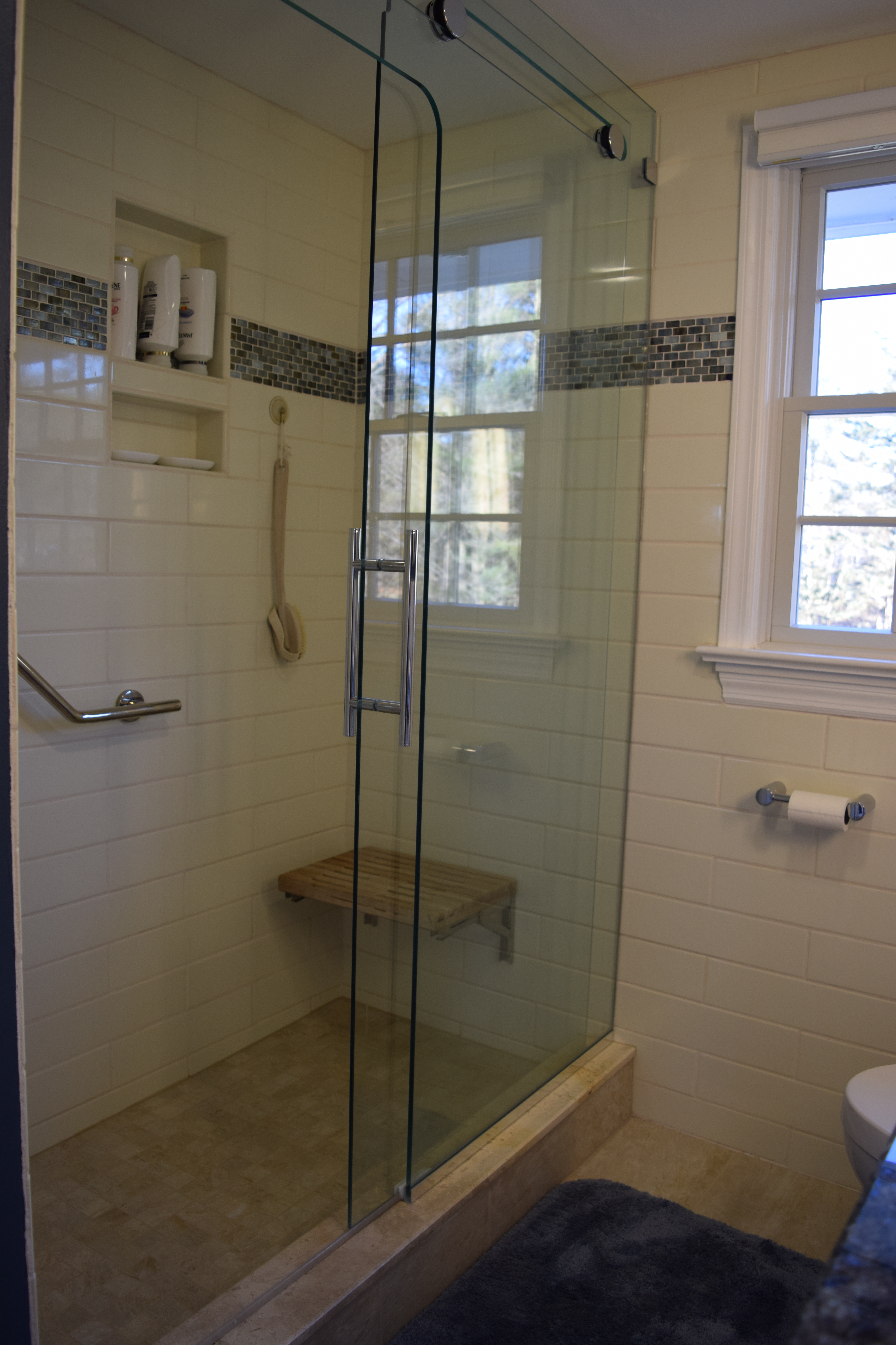 dsc_0023 Published December 27, 2016 at 4000 × 6000 in Bathroom remodels The finished shower. The teak bench folds down flat against the wall and the rolling, barn-door-style glass door is pretty cool. Like Loading...
