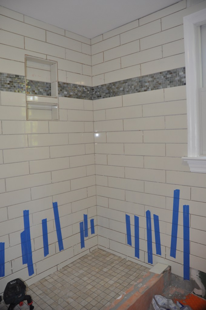 dsc_7855 Published December 27, 2016 at 2848 × 4288 in Bathroom remodels The large format subway tiles were installed in a running bond pattern and the glass accent band injects a bit of color. Painter’s tape holds the bottom courses in place until the mortar sets up. Like Loading...